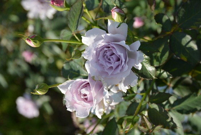 紫藤色的花朵。寶珠瓣的中輪花朵一莖多花成簇綻放,時而會開單花。以茶香為基底,柔和地融入大馬士革和粉末香,中程度花香。纖細,帶有幾分夢幻的魅力。單花花期長,能長時間欣賞花朵的美麗。