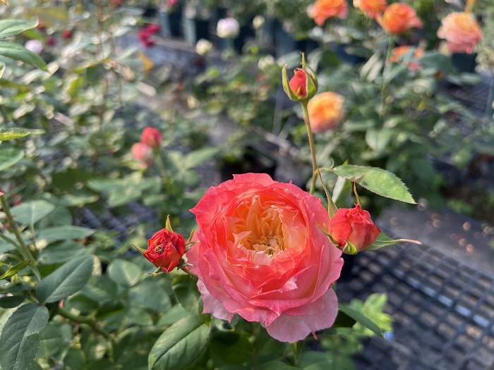 產品規格為3.5吋黑軟盆,盆口直徑約12公分、深15公分;植株高度含盆約30~60公分;嫁接方式為靠接,砧木為多花野薔薇(無刺砧木),僅採3~5公分高的枝條作為砧木。